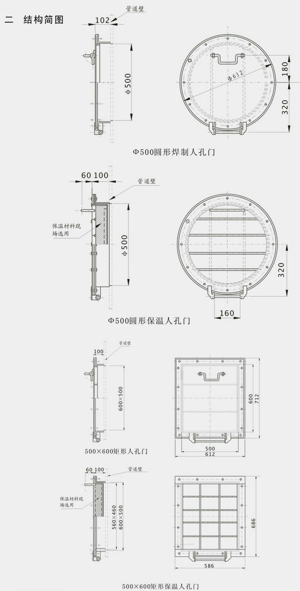 人孔門按形狀可分為圓形和矩形兩種;按保溫與否可分為保溫和不保溫兩種;人孔門適用于制粉管道。